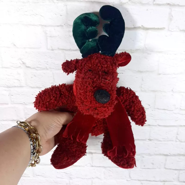 عروسک خارجی و اورجینال گوزن بسیااار خوش رنگ و زیبا ، با شاخ های مخمل سبز کله غازی ، خزش شاین و براق با رده های اکلیلی خیلی زیبا . داخلش شن داره ، رنگش زرشکی براق فوق العاده خوش رنگه. درجه یک .قابل شستشو ست .