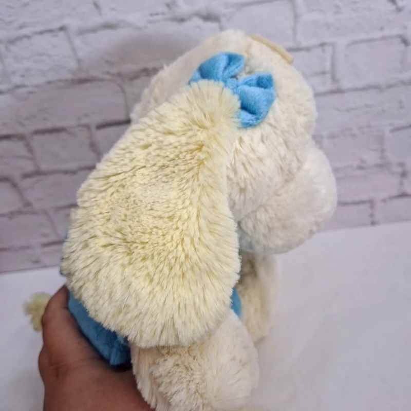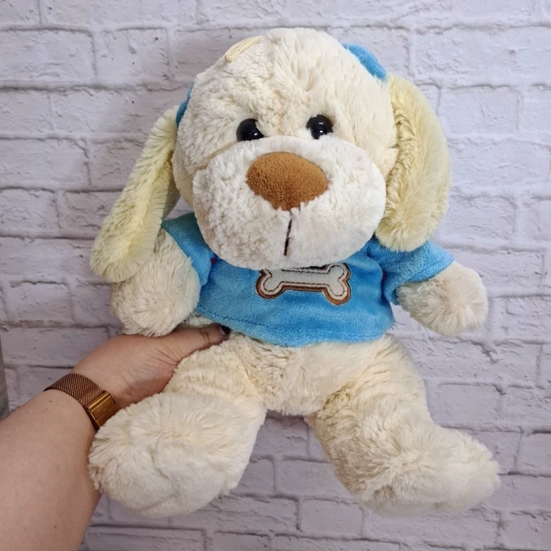 عروسک خارجی و اورجینال بسیار زیبا و با کیفیت سگ تپلی با بلوز مخمل ، این دلبرک تپلی و حجیم هست ، مدلش نشسته است ، اجزای صورتش با نخ های ابریشمی براق گلدوزی شده، بلوز مخمل آبی فیروزه ای براق تنش هست ، پاپیون آبی به گوشش داره ، خزش نرررررم و عاااالی ،ضد حساسیت و قابل شستشو ست.