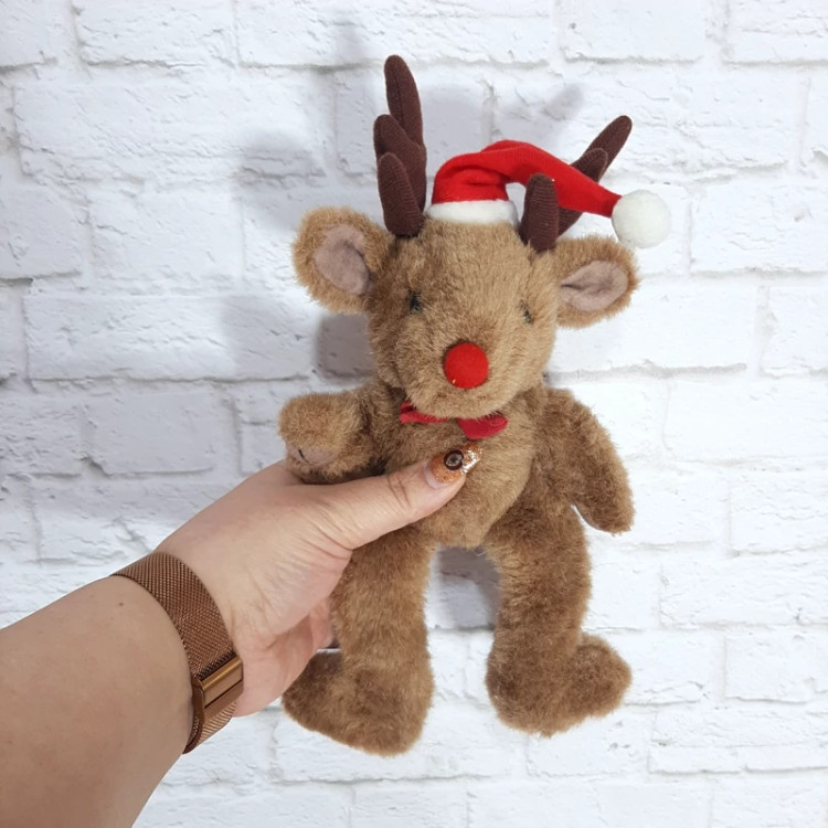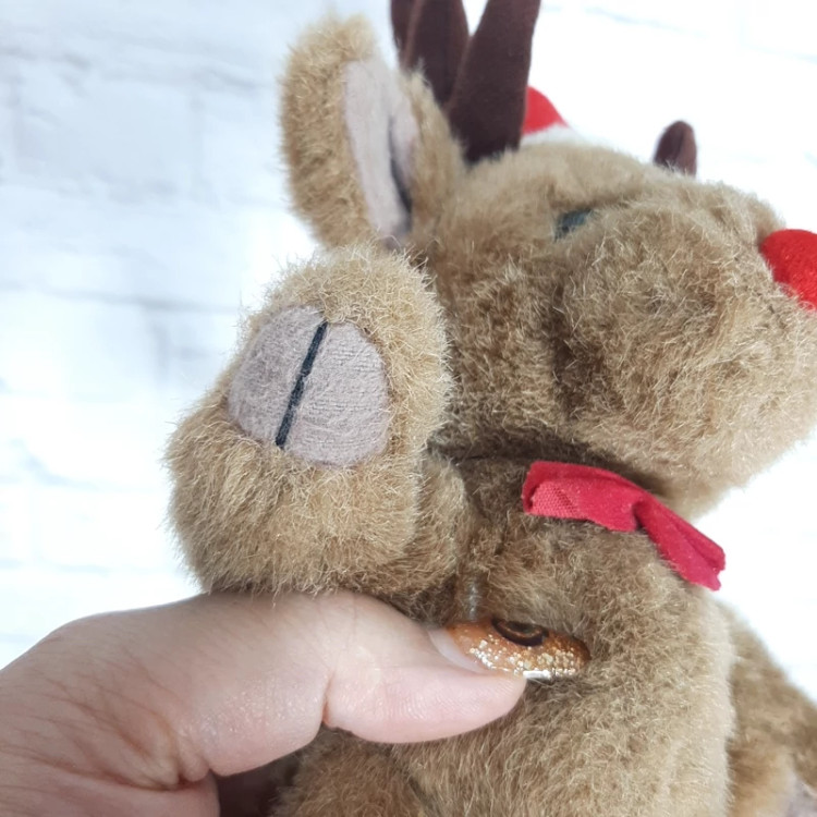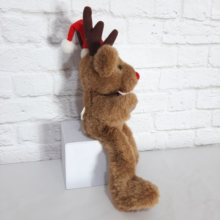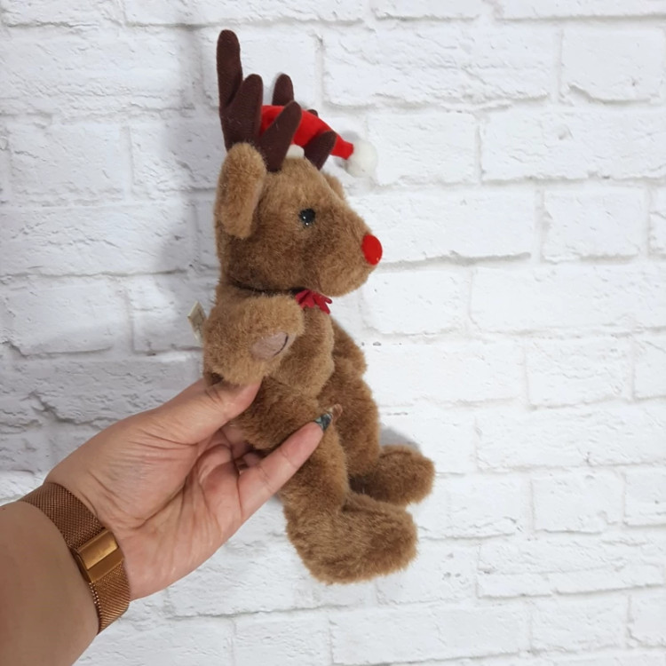 عروسک خارجی و اورجینال فوق العاده با کیفیت و زیبای گوزن خزش سوزنی مدلش نشسته است .قابل شستشو . داخل دل و دست و پاهاش شن داره.کلاه و شال گردن قرمز داره ، جنسش ضد حساسیت ، خز سوزنی درجه یک براق .