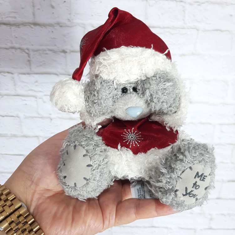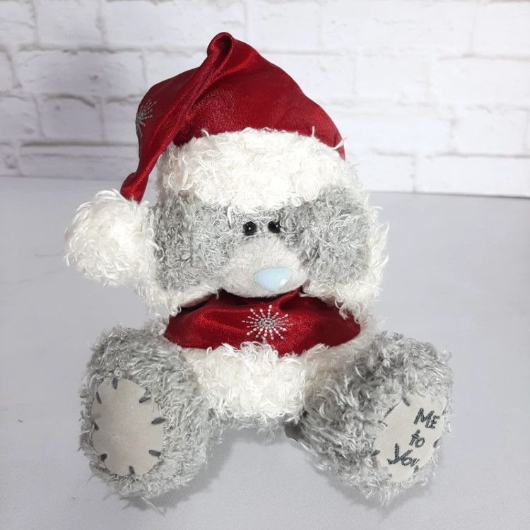 عروسک خرس محبوب و زیبای برند می تو یو با لباس زمستانی دست هاش را گذاشته کنار سرش روی کلاهش