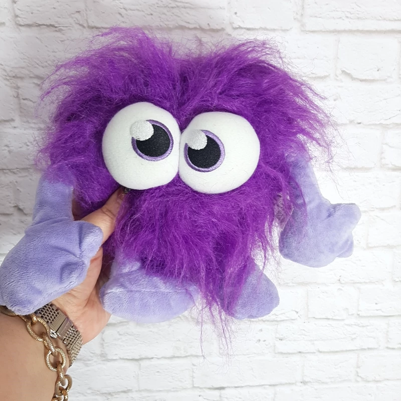 عروسک بسیار زیبا و با کیفیت غول بنفش با چشم های قلنبه و خز های بلند. دست و پاهاش از جنس مخمل هست . بالای سرش بند داره برای آویزان کردن. قابل شستشو ست.