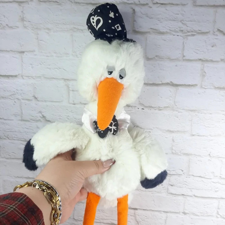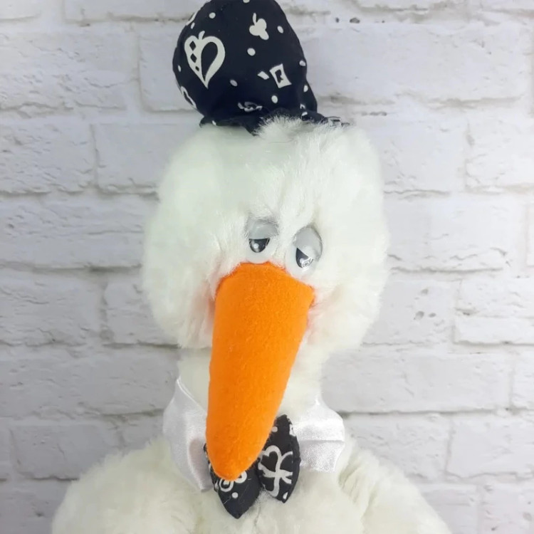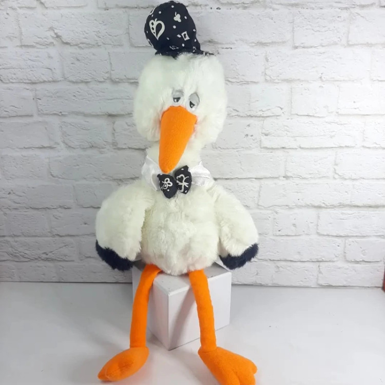 عروسک پولیشی لک لک بسیار زیبا و با کیفیت با کلاه و پاپیون.خزش سفید برفی ،نرم و لطیف،قابل شستشو،چشم هاش پلاستیکی درشت.