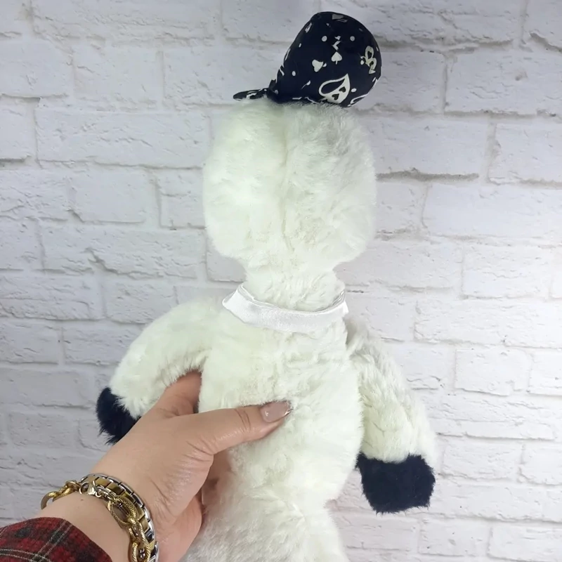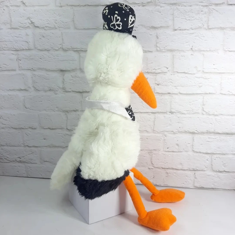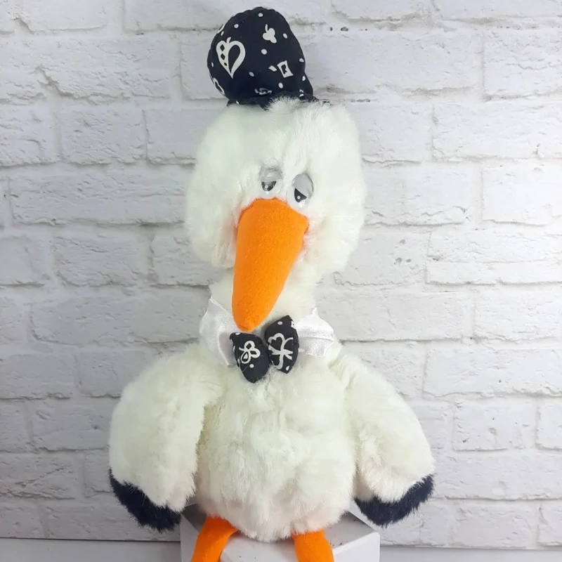 عروسک پولیشی لک لک بسیار زیبا و با کیفیت با کلاه و پاپیون.خزش سفید برفی ،نرم و لطیف،قابل شستشو،چشم هاش پلاستیکی درشت.